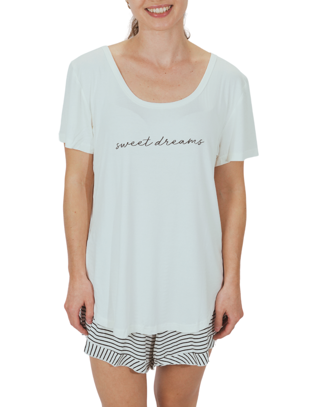 Sweet Dreams! These fun and cheeky slightly flared shorts are paired with a soft pure cotton loose tee - perfect for sleeping or relaxing at home. Buy one for yourself today