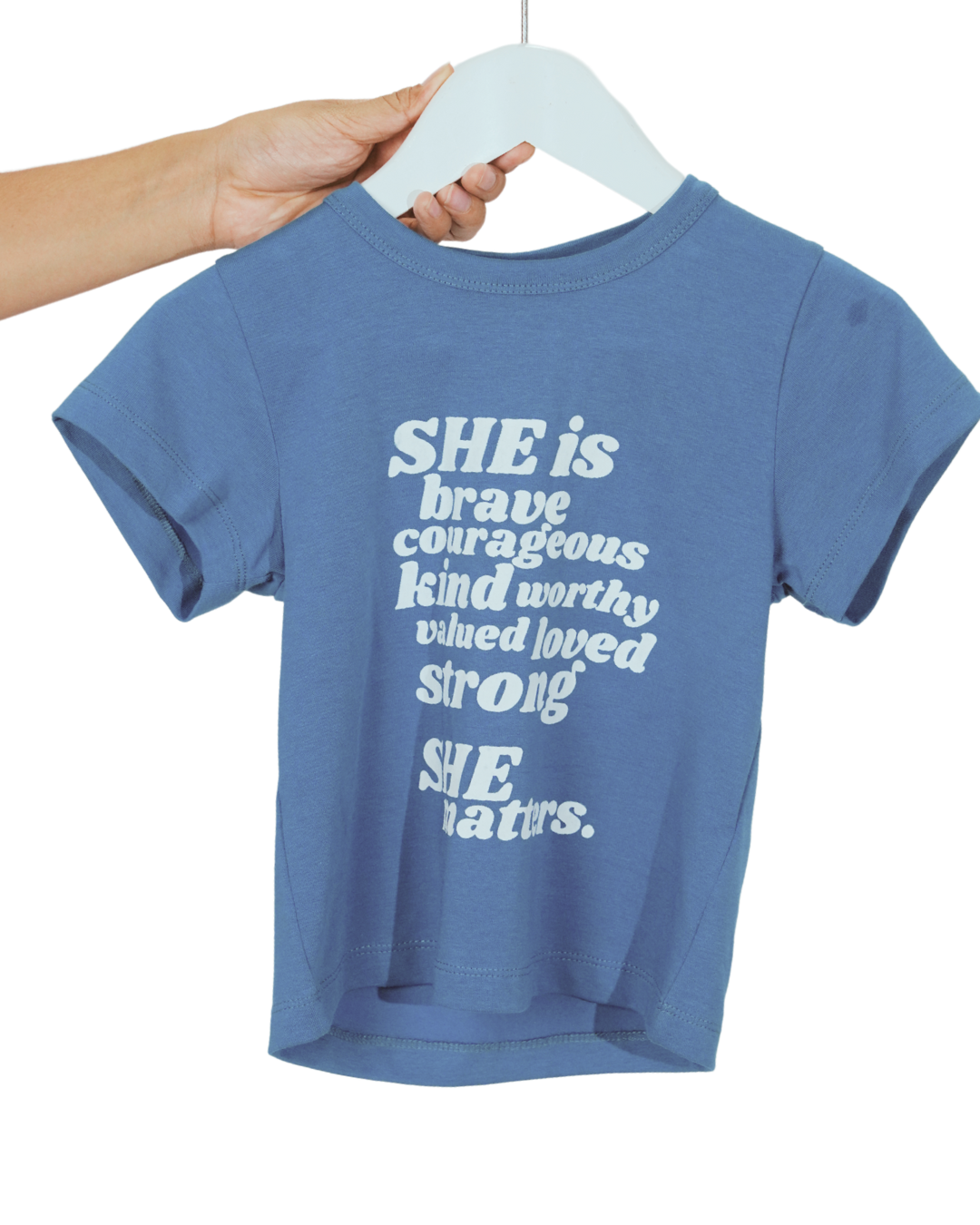 SHE is Brave! This super cute tee is great for girls of all ages. Currently available with the bubble print in Blue and Green.