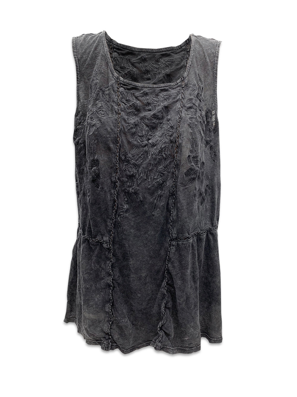 Our embroidered sleeveless top is available in the always fashionable charcoal. This lightweight wardrobe staple has a scooped necklace and flares slightly at the hips, making it a comfortable fit for everyone.